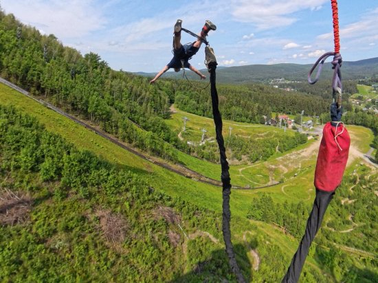 Bungee jumping z televizní věže v Harrachově je velkým adrenalinovým zážitkem. Vylezte na televizní věž rozhodčích do výšky 145 metrů nad městem Harrachov a skočte volným pádem rovnou dolů! Profesionální tým s dlouholetou praxí a nejlepším vybavením na trhu, je zárukou naprosto bezpečného seskoku. Bungee jumping z televizní věže u skokanských můstků v Harrachově si navíc můžete užít celoročně.