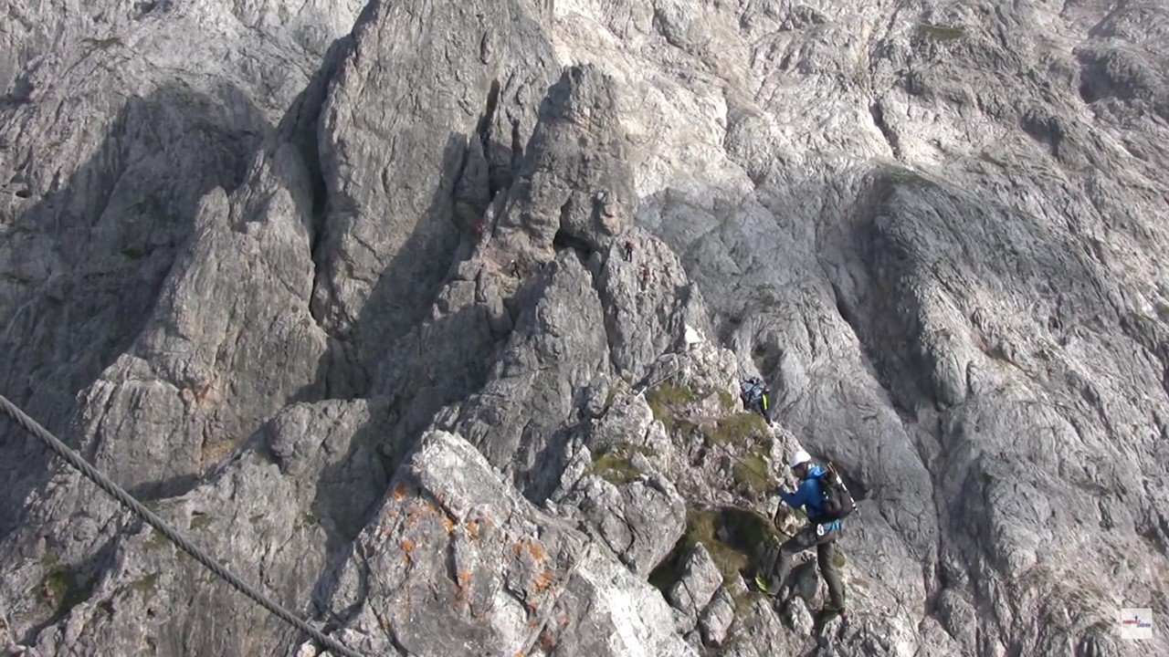 Nejkrásnější pohled se nám naskytl po vylezení věže Teufes-hörndl za flying foxem. Dechberoucí podívaná na velkou část zajištěné trasy s dominantou věže Kummetstein a po ní lezoucí lezci, kteří z dálky vypadají jako mravenci. Obtížnost se o něco zvyšuje, jsou zde i dvě místa obtížnosti C - D, ale daleko větším problémem je délka cesty. Už to bude skoro 6 hodin co jsme vycházeli od parkoviště a z toho 4 hodiny strávené na ferratě ubralo hodně energie a sil.