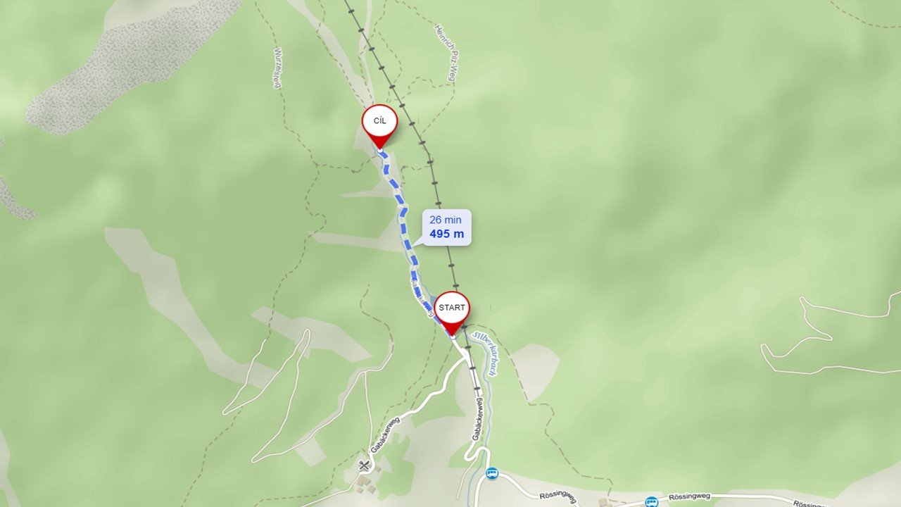 Nejprve se vydáme z parkoviště u vstupu do soutěsky Silberkarklamm, kde je nutné zaplatit malé vstupné. Následuje krátká procházka soutěskou, až dojdeme k místu s lanovým mostem nad rozbouřeným potokem. Pozor, cestou minete nástup na Hias klettersteig, ale tam nyní naše kroky nevedou.