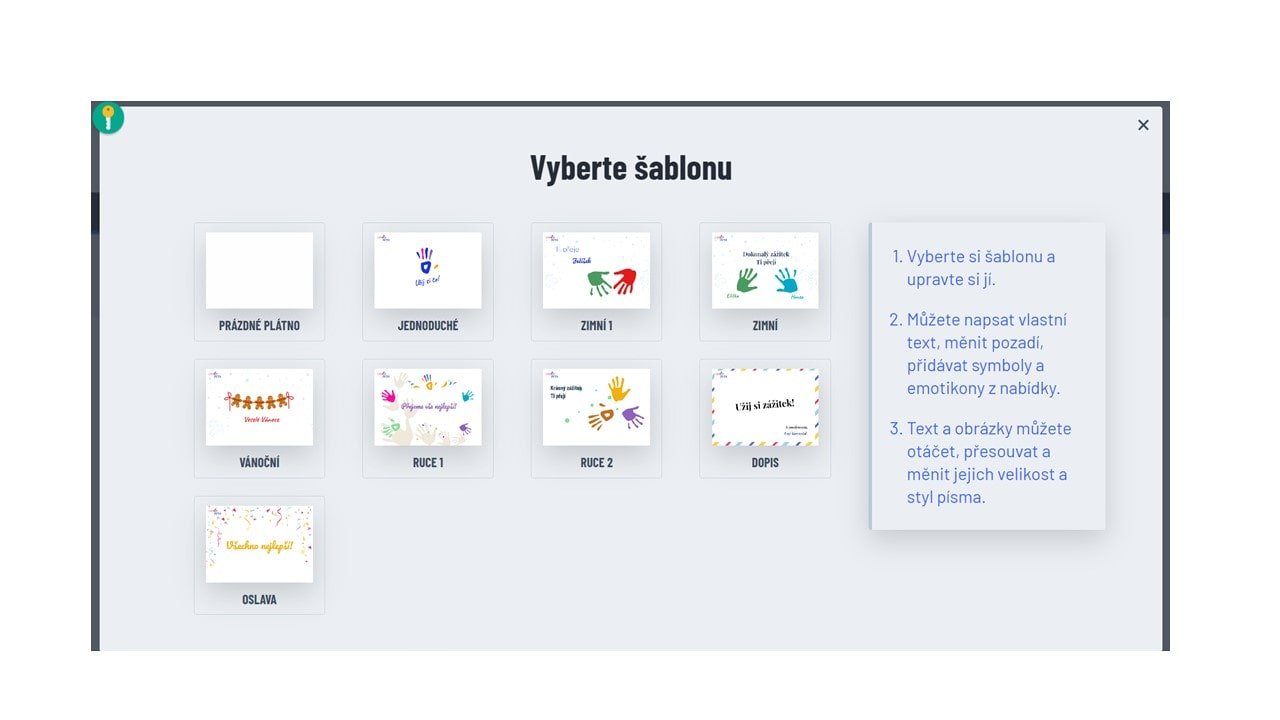 Otevřete si editor. Vyberte přednastavenou šablonu nebo prázdnou stránku. Pokud se vám přednastavená šablona líbí, a nechcete na ní nic měnit, kliknete na zelené tlačítko ULOŽIT A ZAVŘÍT. Máte hotovo! Osobně si však myslím, že by byla škoda nevyužít naplno celý potenciál naší aplikace, zvlášť když je to tak jednoduché a zábavné.