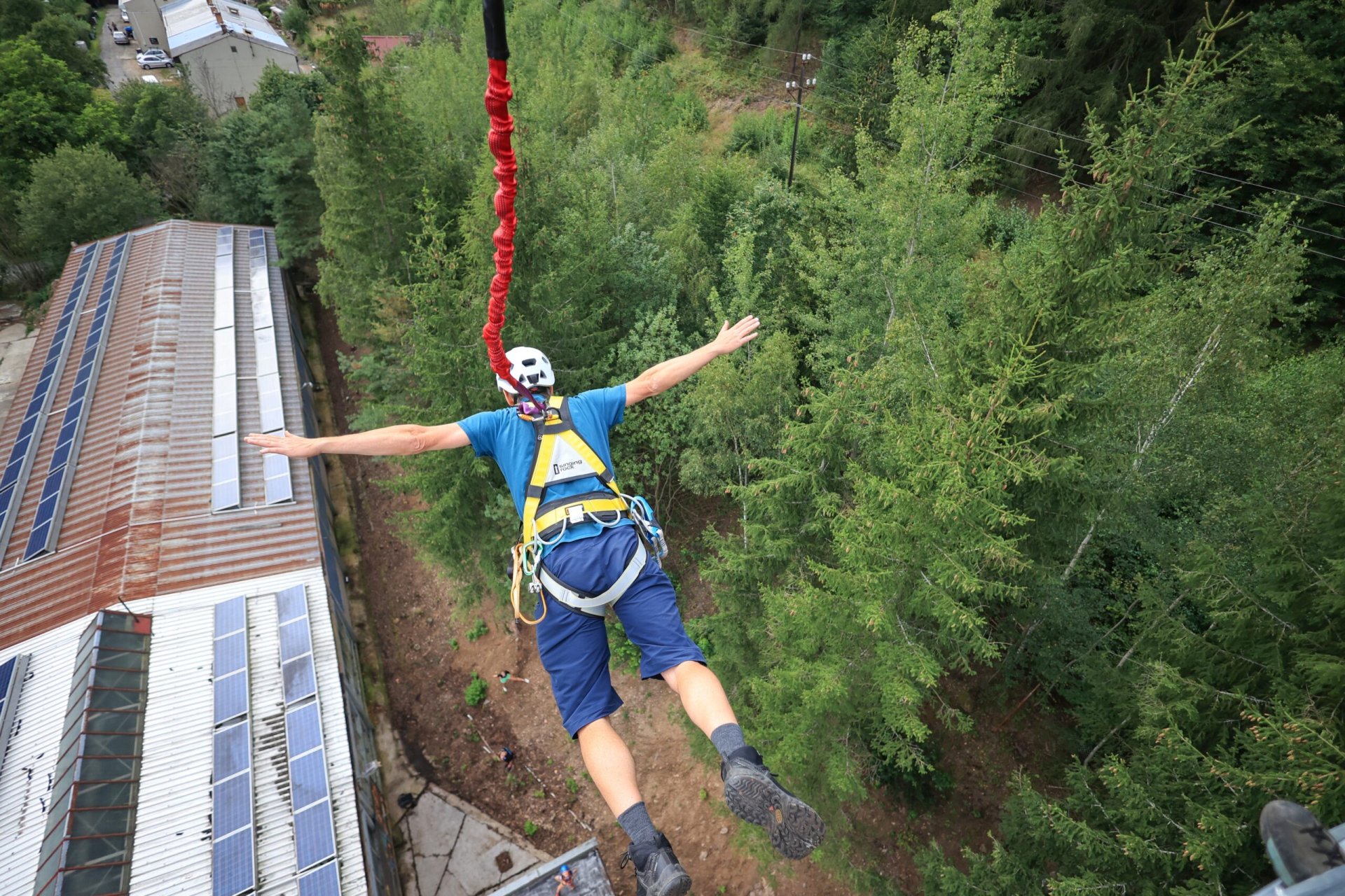 Jakmile se dostanete na plošinu, zbývá poslední krok, nebo možná skok? Instruktor vám připevní k bedernímu pásu pružné lano a pak už je to jenom na vás. Pokud si na to netroufnete, nic se neděje, můžete dolů slanit.