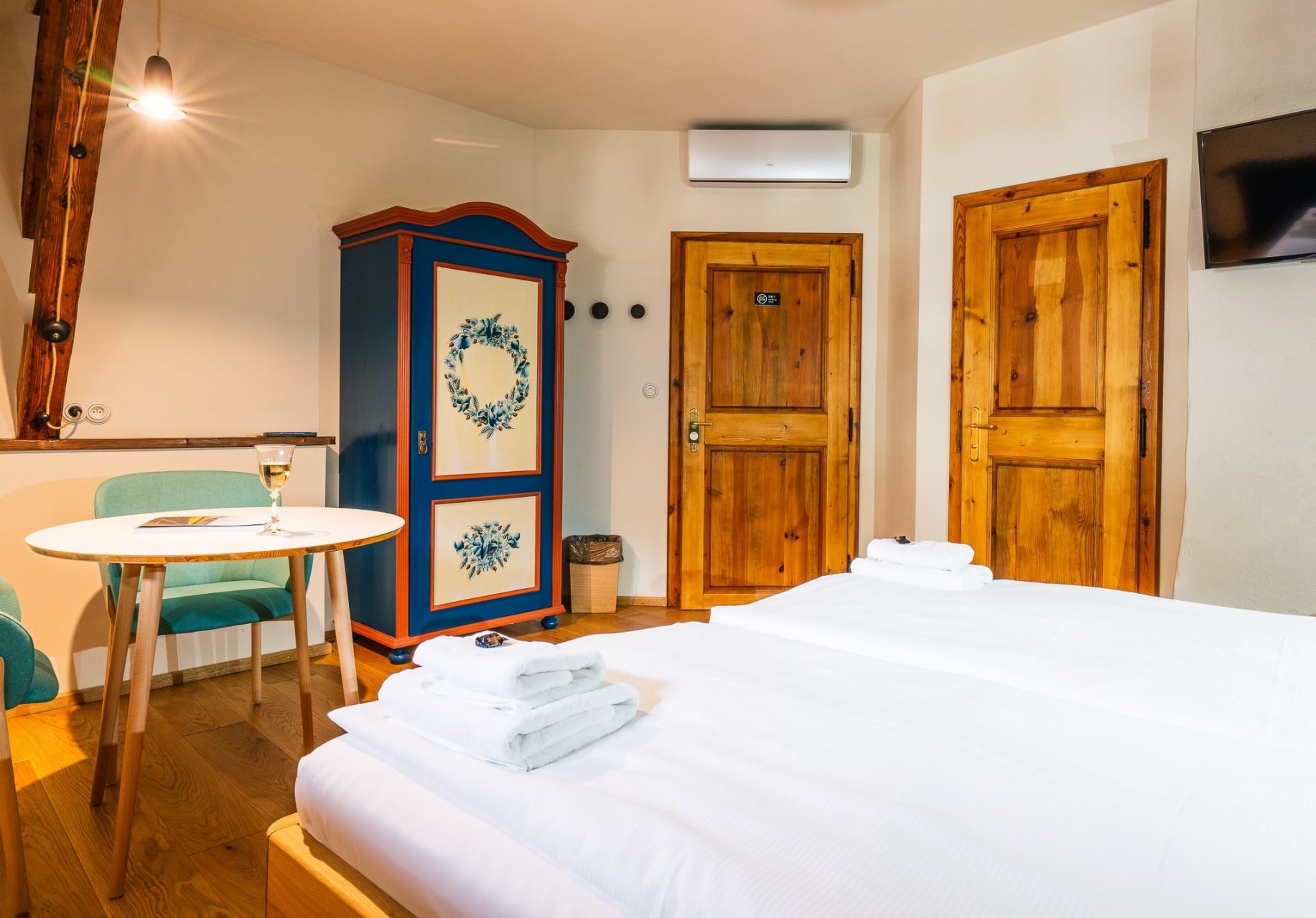 Druhým podkrovním pokojem je TOMANDL. Útulný podkrovní pokoj, který prošel v roce 2020 kompletní rekonstrukcí. Pokoj je vybaven stylovým dubovým nábytkem, klimatizací, minibarem a kabelovou TV s Netflixem. Unikátní ozdobou je ručně malovaná šatní skříň. V tomto pokoji bydlel řezník Tomandl Höricer.