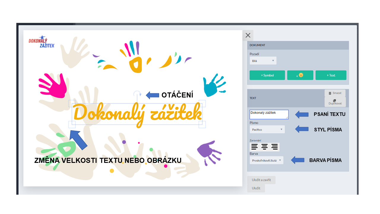 Princip je jednoduchý: VLEVO (na monitoru) / NAHOŘE (u mobilní verze) uvidíte, jak bude vaše věnování vypadat, můžete v něm provádět jakékoliv změny (posouvat a otáčet obrázky nebo měnit velikost písma). VPRAVO (PC verze a notebook), DOLE (mobilní verze) naopak napsat vlastní text, změnit barvu písma, vybrat si z nabídky našich obrázků nebo emotikonů. Jakmile budete s výsledkem spokojeni, kliknete na tlačítko ULOŽIT A ZAVŘÍT.