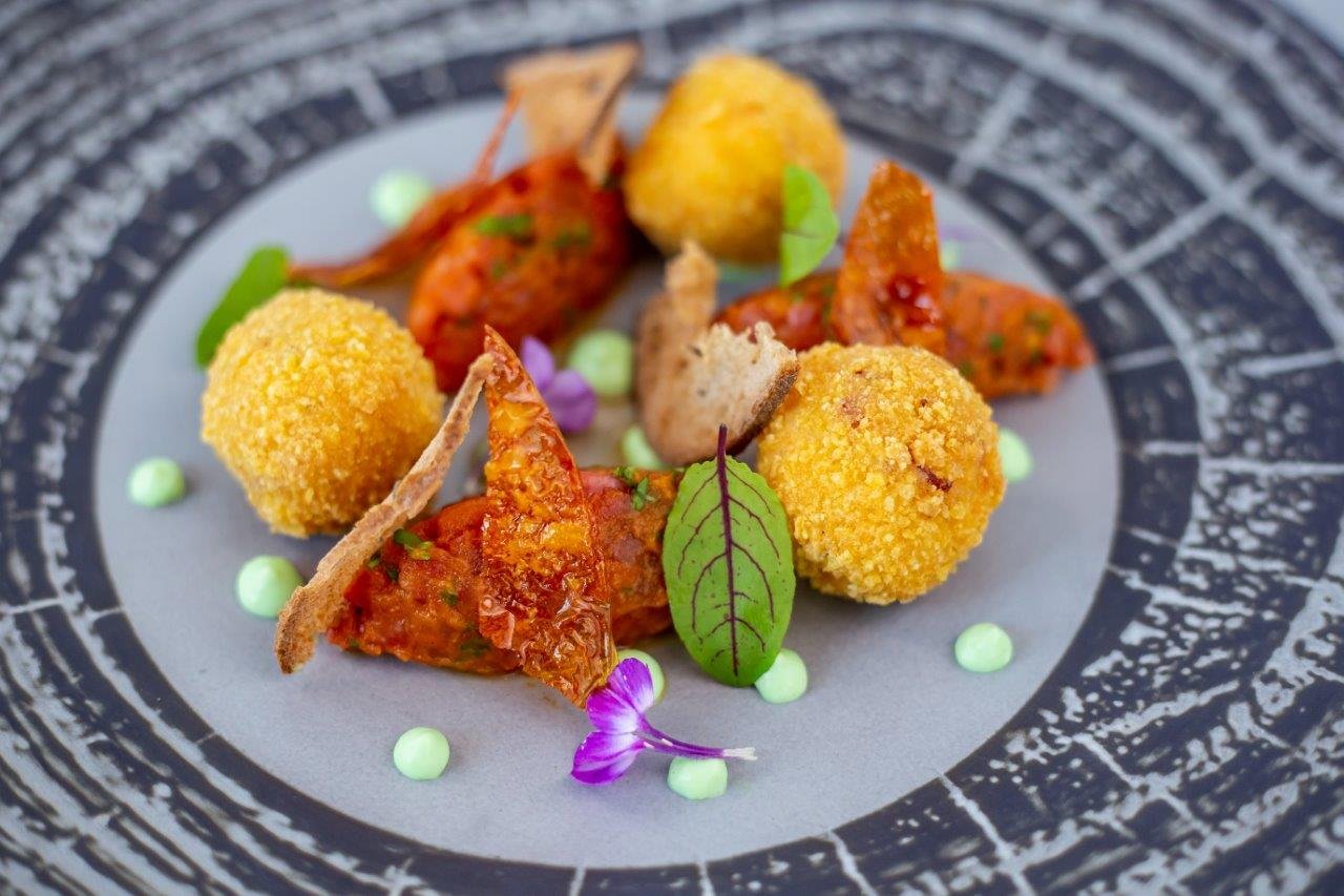 Pošírovaný mořský ďas s kořeněným bramborovým pyré, fava fazolky, radicchio, gelem z krvavých pomerančů a omáčkou z řapíkatého celeru