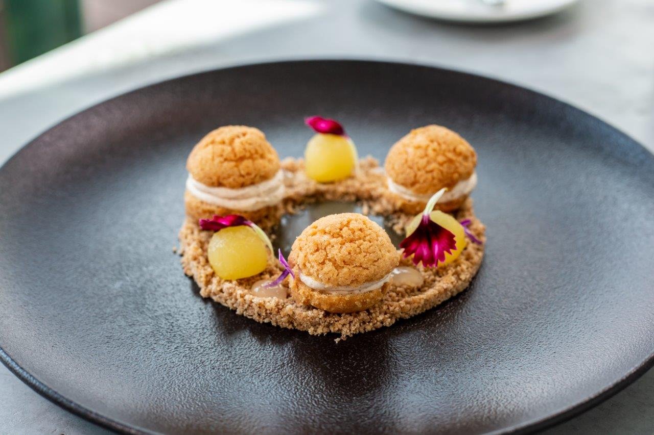 Kávový mousse s maracujovým želé, pomerančový gelem a mléčnou pralinkou s praline z kakaových bobů