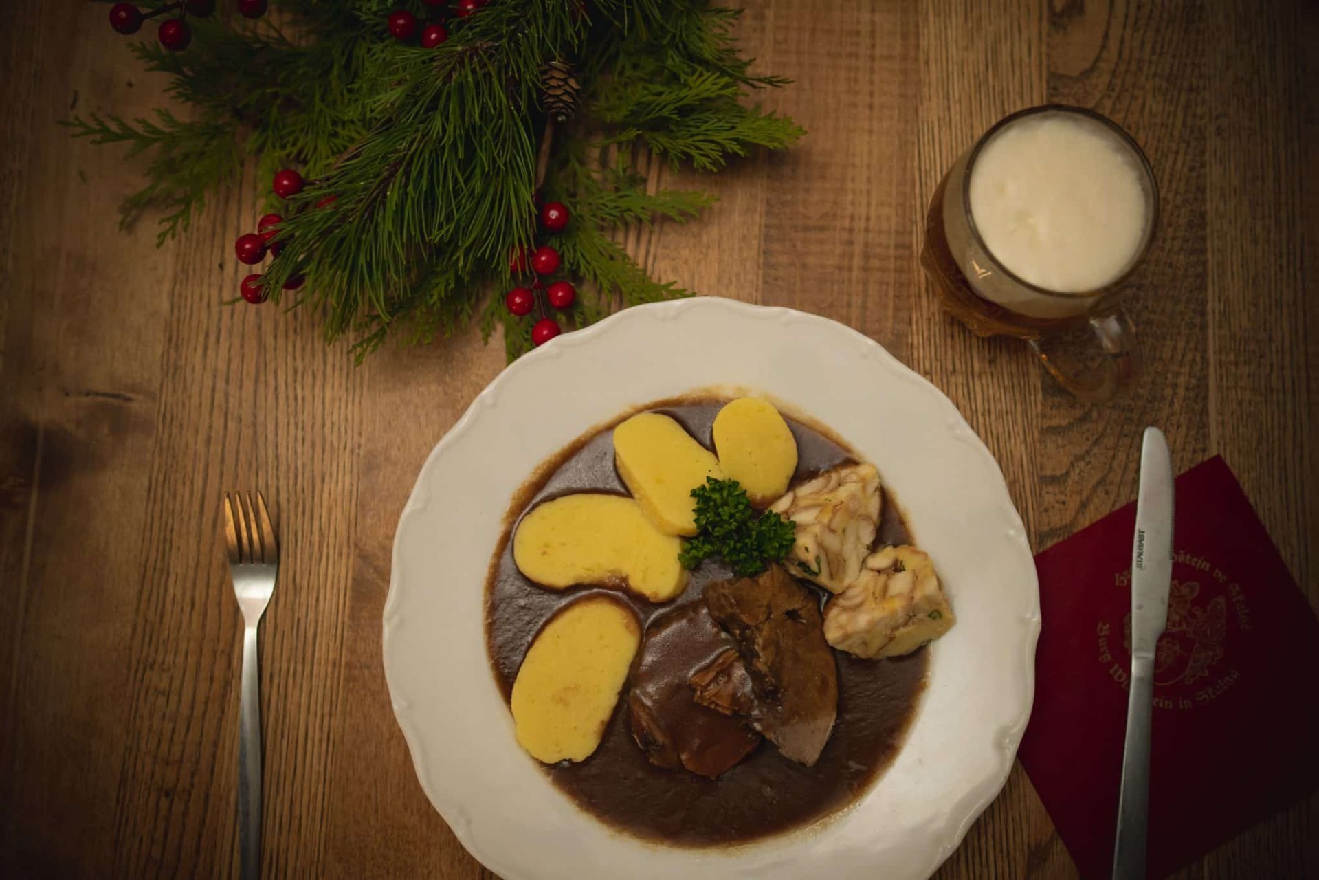 Druhý chod – Mezi lesem a ohněm „Jelení steak se šípkovou omáčkou“ Jemný steak z mladého jelena, připravený s úctou k lesní zvěři, podávaný se sametovou šípkovou omáčkou, grilovanou bramborou ve slupce a doplněný sušenými švestkami, brusinkami a bylinkami. Nápoj: Červené víno z hradního sklepení, plné, harmonické, k poctivému masu hradní kuchyně.