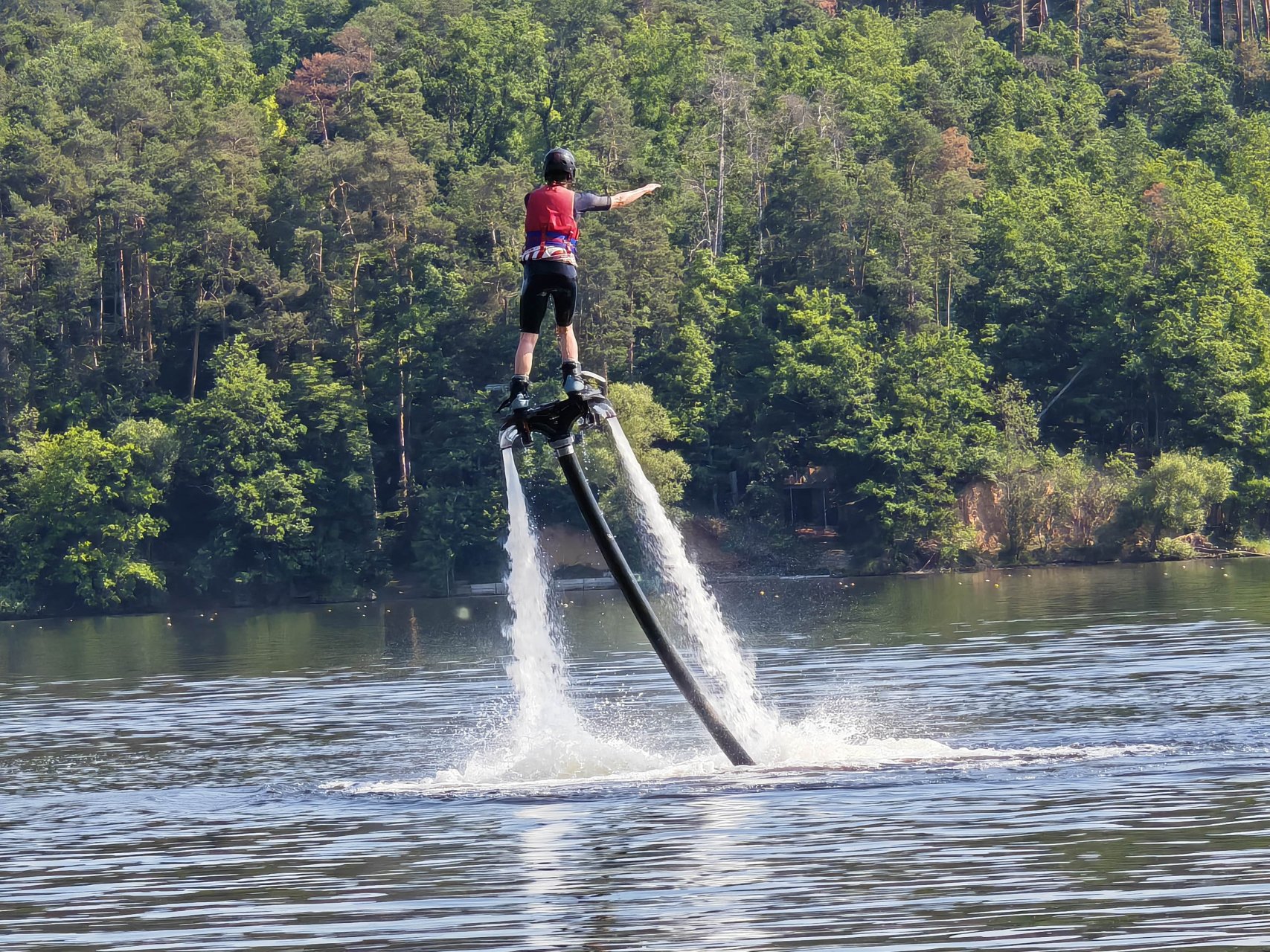 Flyboarding v Ejpovicích u Plzně je adrenalinové létání nad vodní hladinou za pomocí flyboardových bot. Stačí si boty obout a rázem se budete vznášet nad vodou. Flyboardové boty jsou poháněné proudem vody, což umožňuje kromě létání nad vodní hladinou, také potápění a rychlé vynořování.